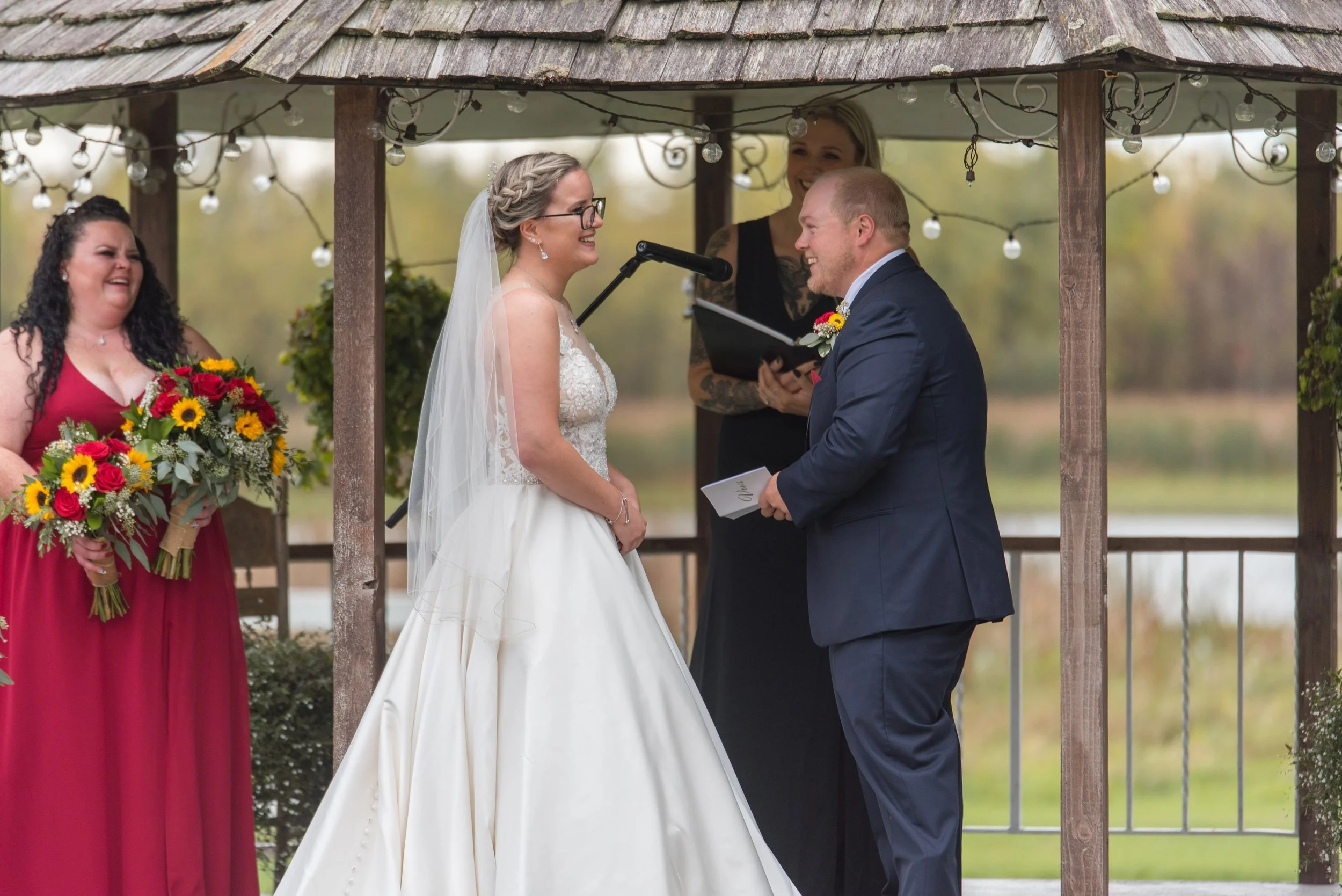 If you have selected an outdoor ceremony space, stand in front of any decor (like an arch or a gazebo) rather than underneath it so that you don’t wind up with funky shadows across your face from those decorations or structures.