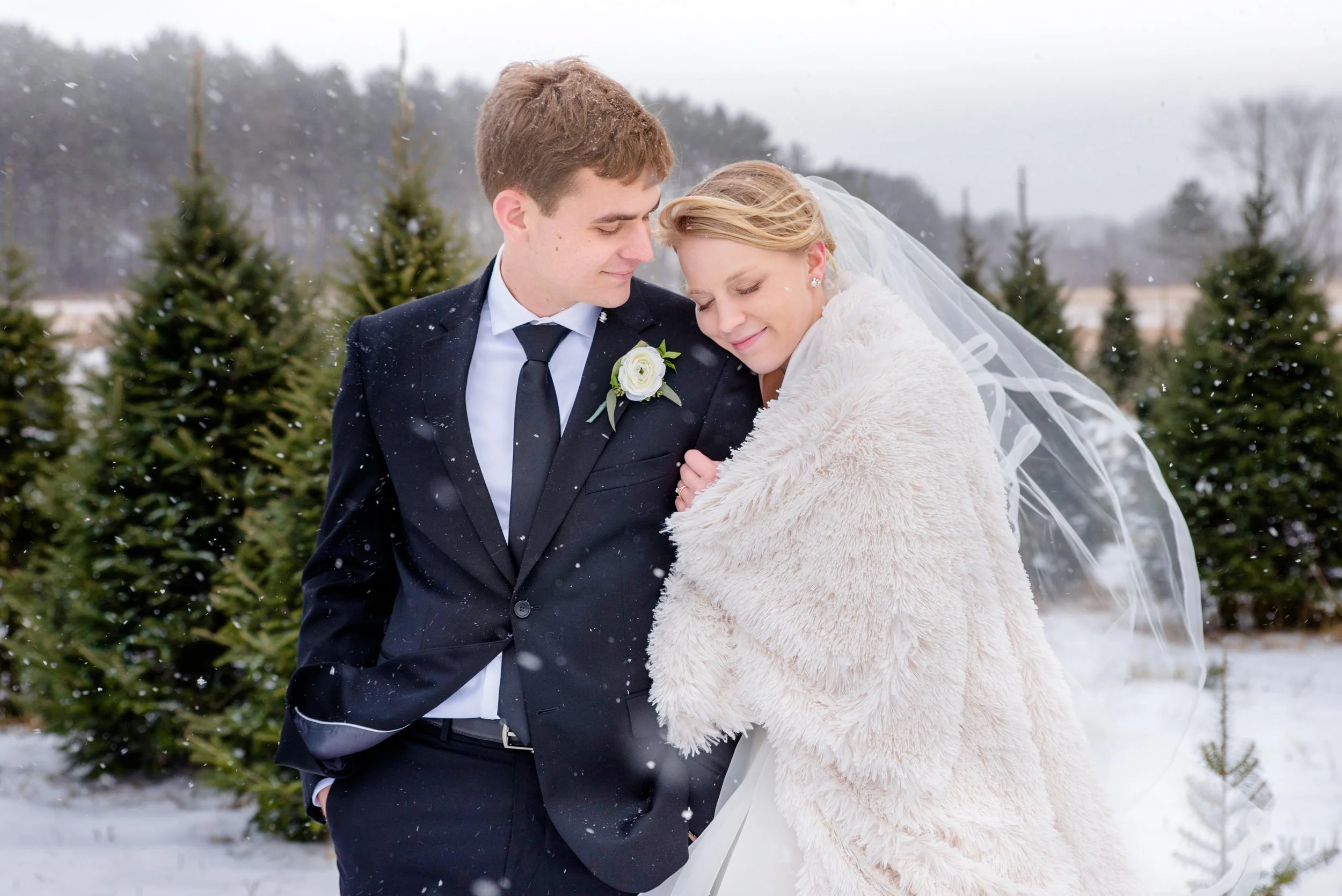 A classic peacoat and scarf can give your groom’s look a classy edge, while a faux-fur wrap elevates a bride’s overall look in a winter wonderland. Also, consider gifting your bridal party scarves or faux-fur wraps that will both keep them warm and make for fun images.